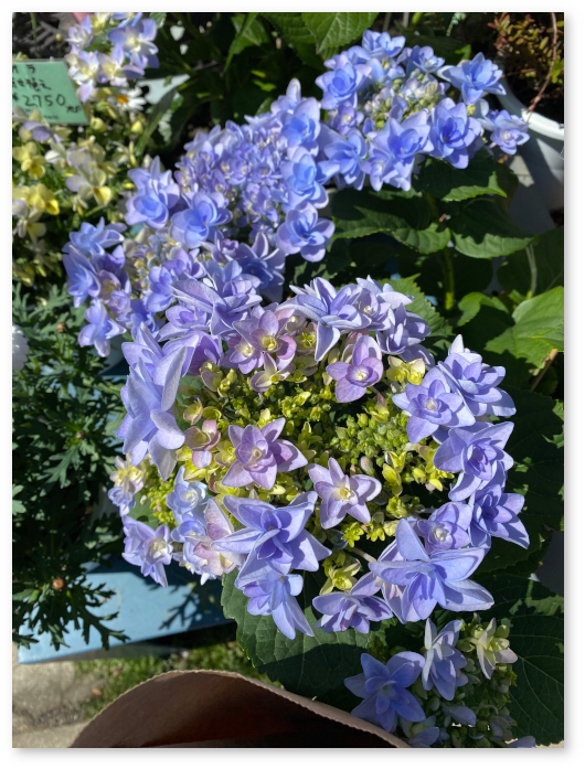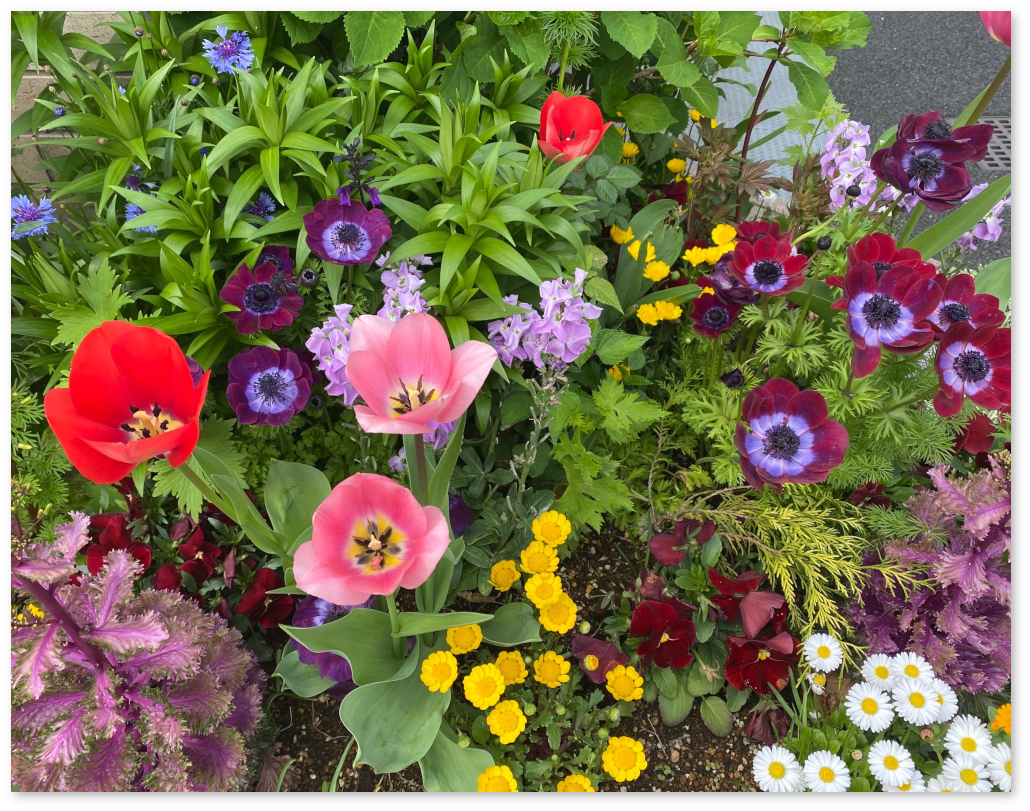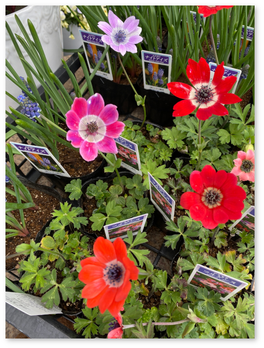 アネモネの花もいろいろな形のものが見られるが、八重に混じって一重の花が咲いているのも可憐。写真は園芸店で撮ったもの。