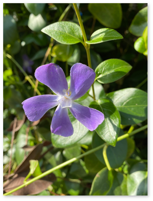 散歩の途中、ツルニチニチソウがちらほら咲いているところがあった。