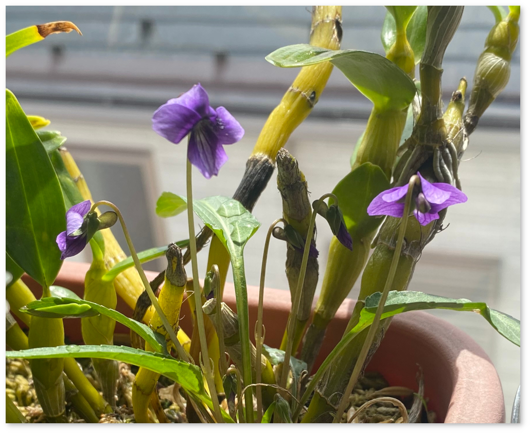 部屋に取り込んであるデンドロビウムのプランターに、スミレの花が咲いた。