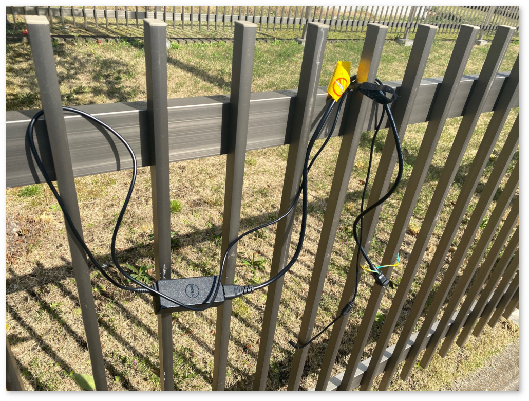 たぶん、落ちていたACアダプタを落とした人が探しに来るだろうということで、フェンスに絡ませてある。