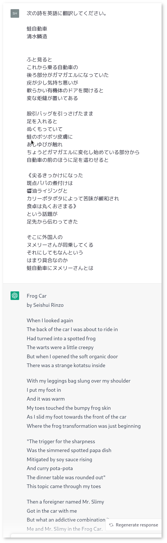 I think ChatGPT's translation accuracy is quite impressive, and it even suggests words that can be picked up when retranslating. I've decided to try translating some poems since it seems capable of doing so. Recently, I tried putting out something that I thought would be difficult to translate, but it seems to have been translated well.