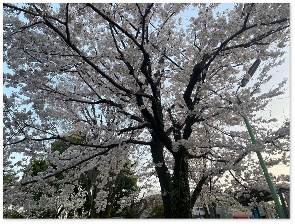 The photo is of the weeping cherry tree in the neighborhood at dusk. It has started to scatter, and the rain at night will scatter it even more.