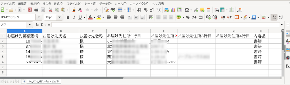 クリックポストのサイトに「まとめて申込み」みたいに書いてあり、テンプレートがダウンロードできる。これはエクセル用だと思うが、Libre calcで使える。