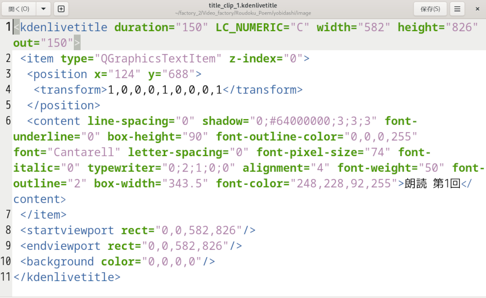 小タイトルで詩作品のまとまりがあるので、回数だけ変えたタイトルクリップを生成するとき、Kdenlive上で作って保存したうえ、下のようにテキストエディタで開き、回数のところだけ変えていけば楽なことがわかった。